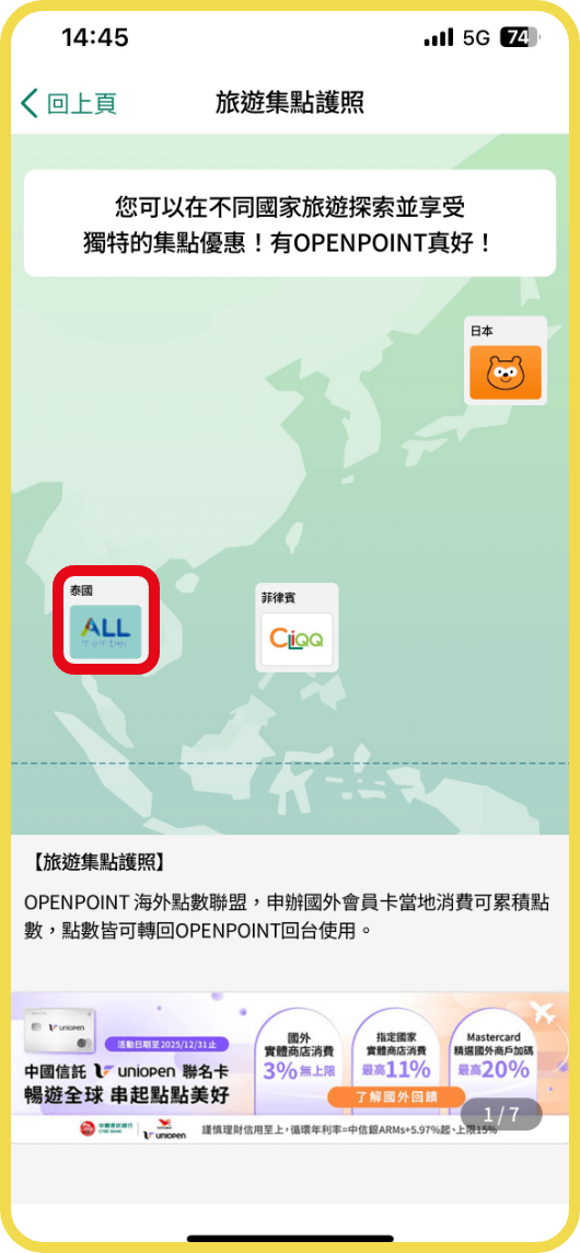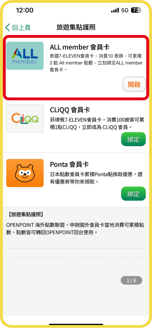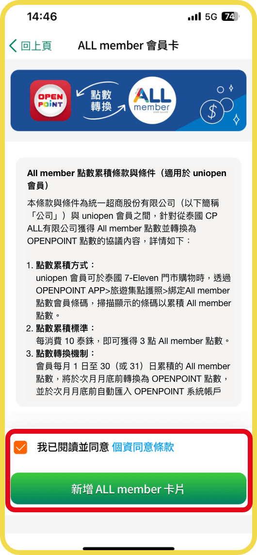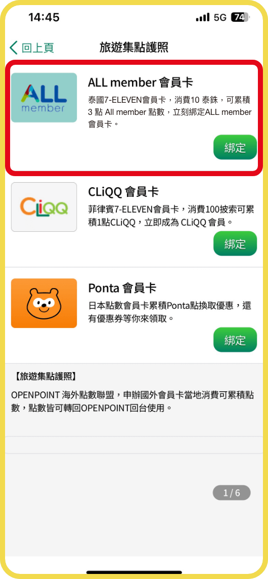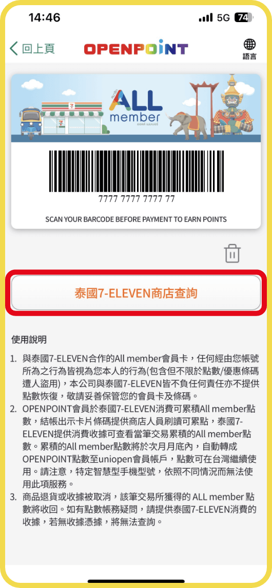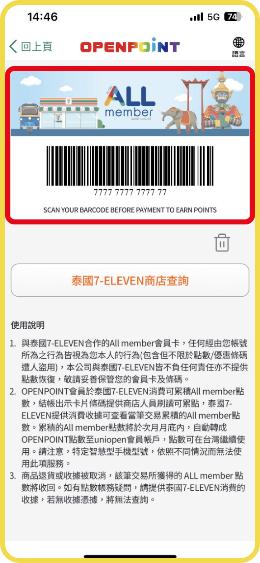綁定後,在泰國7-ELEVEN消費享All member點數回饋。